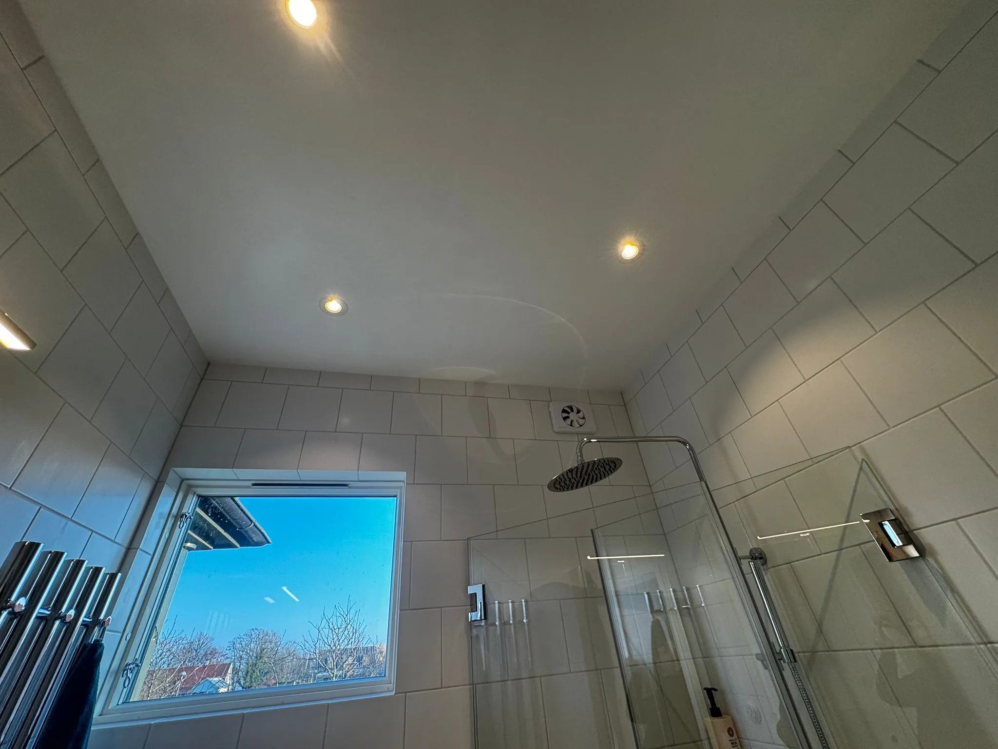 NRG El har utfört en komplett elinstallation med fokus på säkerhet och precision. Innan badrummet togs i bruk utfördes omfattande tester: Kontinuitetskontroll av skyddsjord. Isolationsmätning av golvvärmekabeln (värde: 500 MΩ – perfekt resultat). Funktionskontroll av jordfelsbrytare för ett tryggt och säkert våtrum.