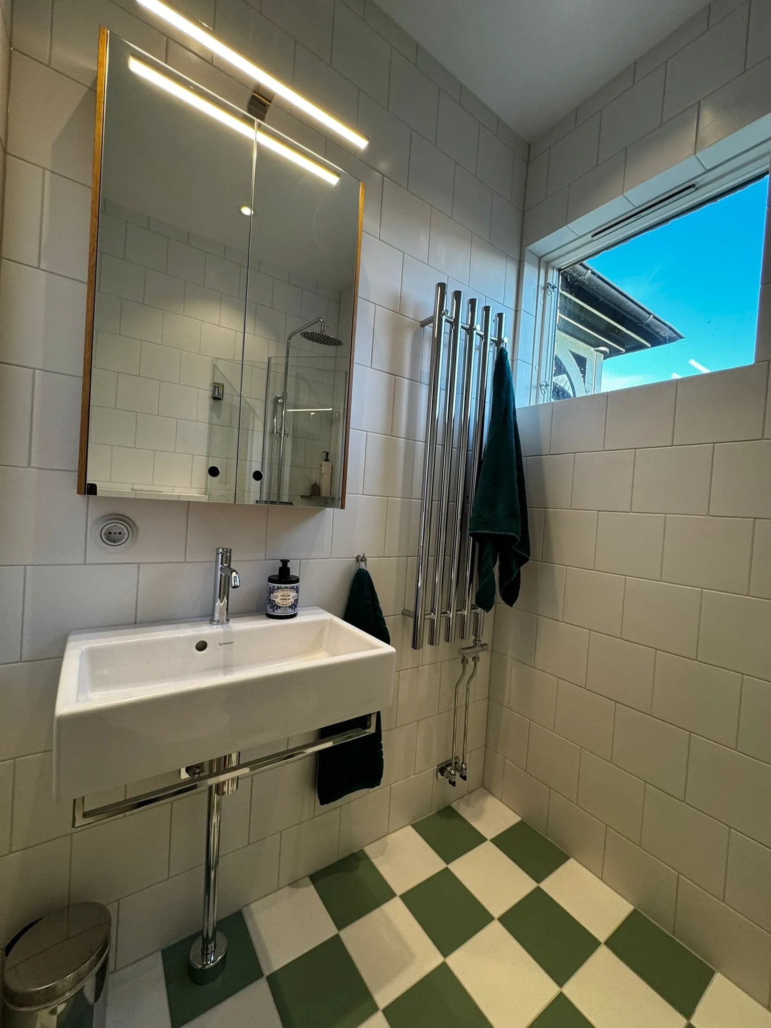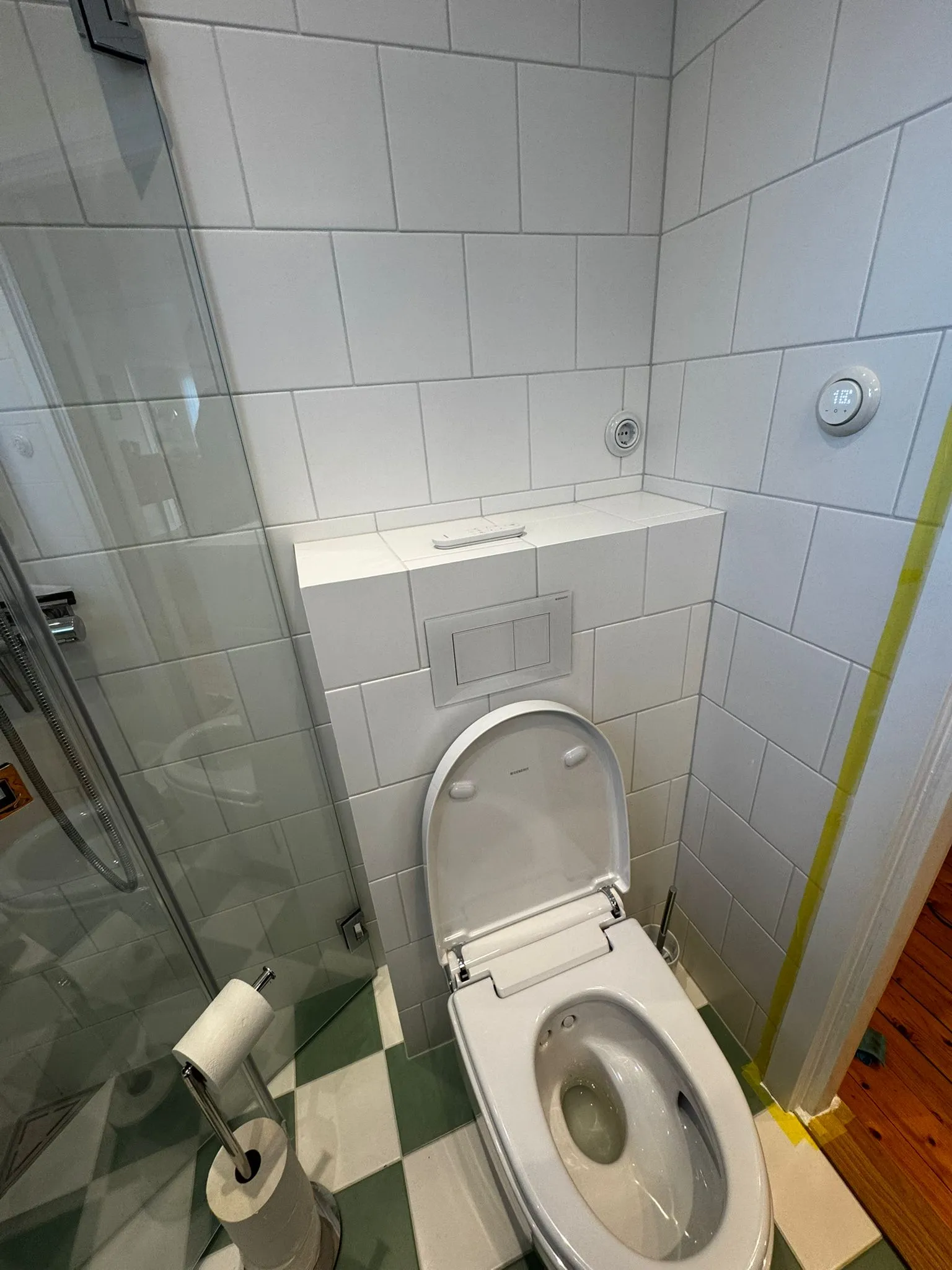 För att skapa ett stilrent badrum utan synliga rör installerade vi ett modernt RiR-system (Rör-i-Rör). Detta innebär att alla vattenledningar ligger skyddade i väggarna, vilket minskar risken för vattenskador och ger ett estetiskt tilltalande resultat. Vi monterade även en inbyggd WC-fixtur och anslöt handdukstorken till husets värmekrets för maximal energieffektivitet.