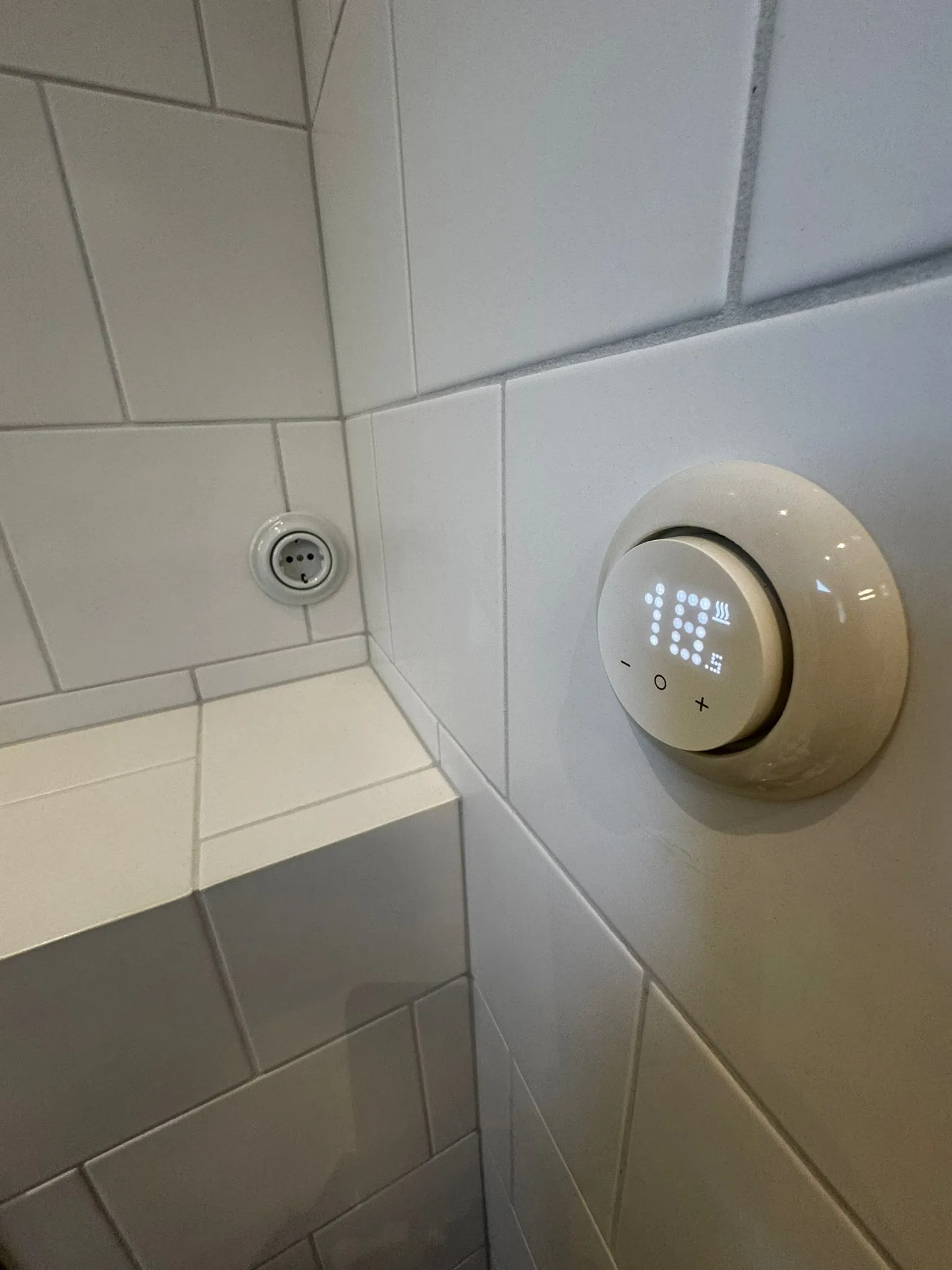 För att ge badrummet den där extra hotellkänslan installerade vi nVent RAYCHEM golvvärme. Tack vare att vi är Certified PRO-installatörer kan vi erbjuda kunden en 12-årig Total Care-garanti. Systemet styrs av en SENZ-WIFI-termostat, vilket gör att kunden kan kontrollera värmen direkt via sin smartphone.